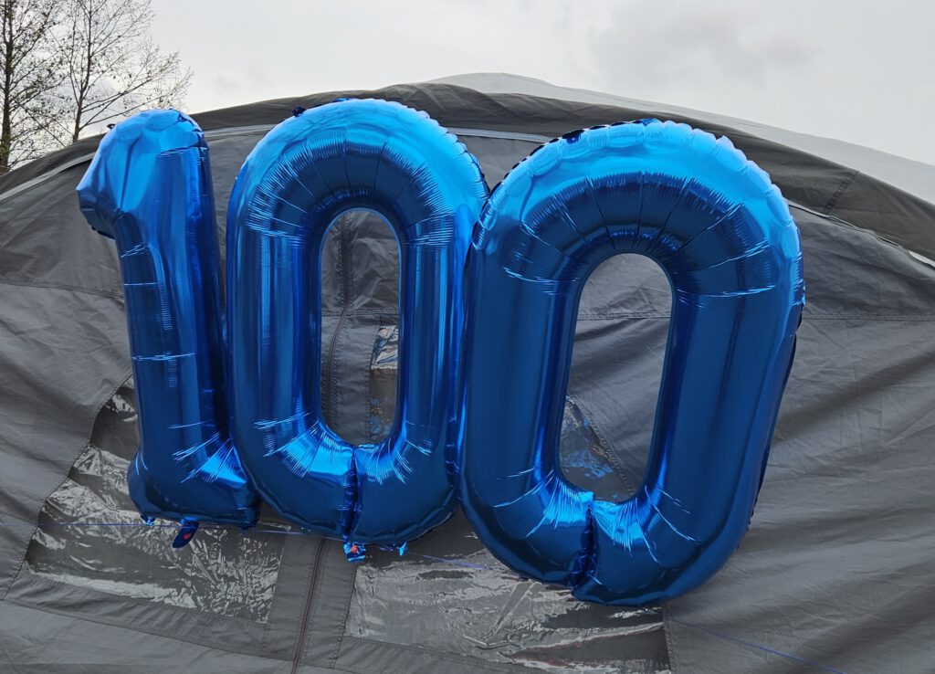 Wir haben das am frühen Nachmittag zum Anlass genommen vor unserem mit einer blauen 100 und einem Traditionswimpel geschmückten Zelt darauf anzustoßen. Und auch Petrus war (leider) dazu geneigt das Jubiläum zu „begießen“. Auch sonst hat er es heute nicht besonders gut mit uns gemeint: Regen, Kälte und ein ungemütlicher Wind vermiesten uns den Ehrentag ein wenig.